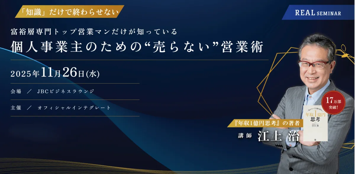 個人事業主や独立を考えている方々に必見のセミナーが、2025年11月26日(水)に東京都港区のJBCビジネスラウンジで開催されます。このセミナーの講師は、株式会社オフィシャルインテグレートの代表である江上治氏。今回のテーマは"売らない"営業術です。江上氏は、数多くの成功事例を持ち、営業界での伝説的存在として知られています。