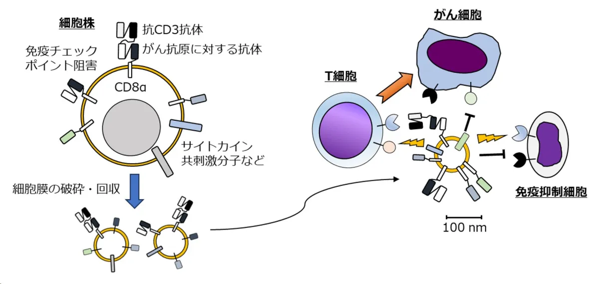 本研究では、この問題にアプローチするために、T細胞の活性化に関連する複数の分子を細胞の表面に搭載し、その細胞膜を単離することで、サイズが100-150 nm程度の細胞膜小胞を作成しました。これらの小胞を体内に投与することで、T細胞のがん攻撃機能を高めることに成功しました。この研究成果は、基礎研究において確認されたもので、今後臨床応用が期待されます。