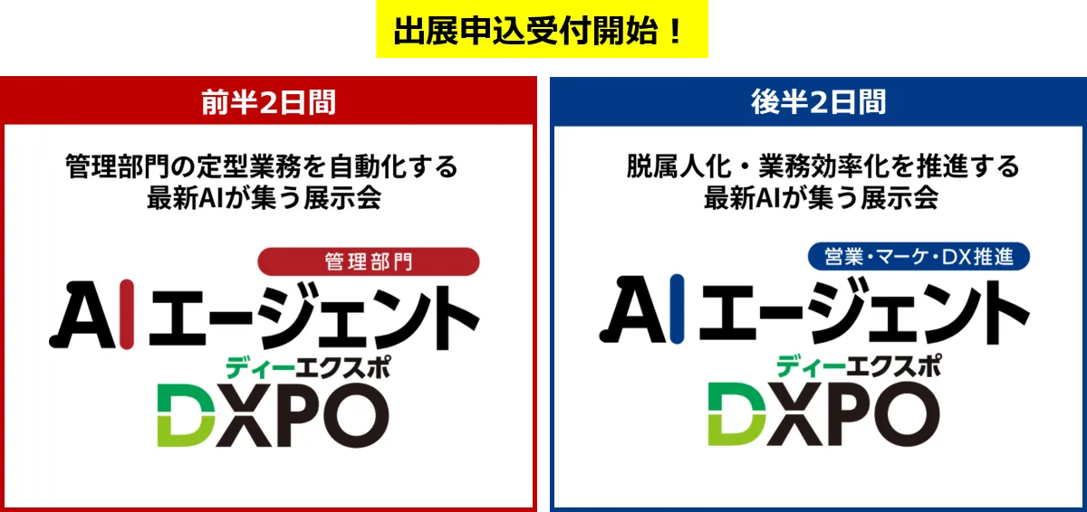 展示会は、前半2日間にわたって「【管理部門】AIエージェントDXPO」として、後半2日間には「【営業・マーケ・DX推進】AIエージェントDXPO」をメインテーマとして実施されます。