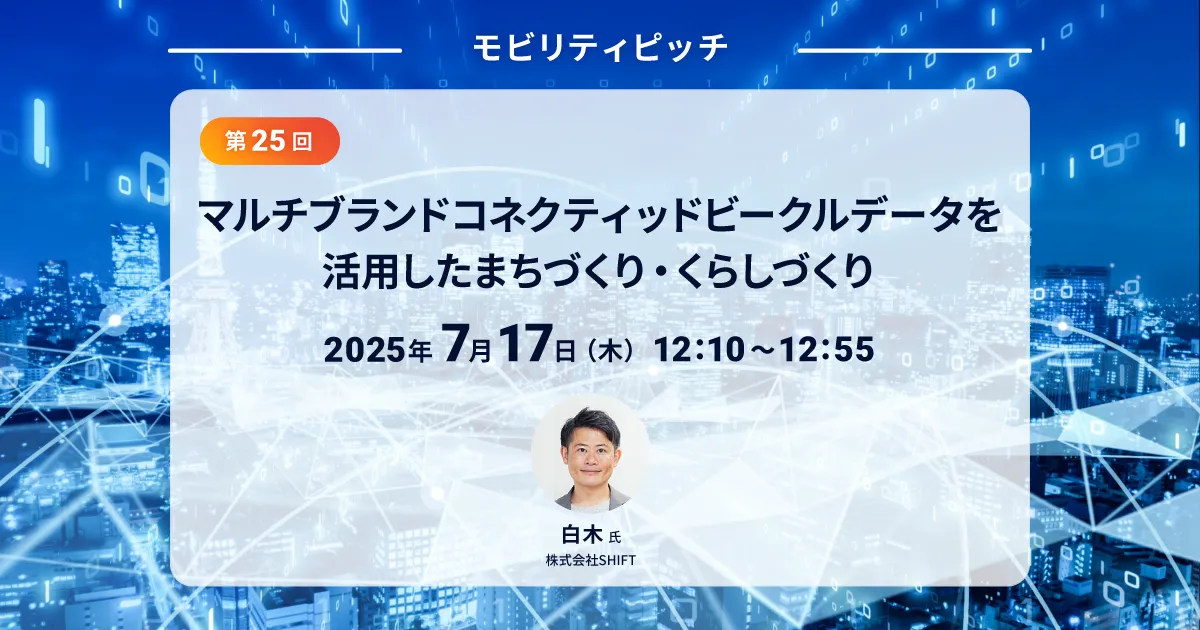 「モビリティピッチ」は、MaaSの実務者が自らの経験と知識をもとに情報を発信し、参加者同士でエキスパートの意見を交換する形式となっています。これまで24回の開催を経て、MaaSに関する正確な情報の普及を図り、業界全体の発展に寄与してきました。今回のテーマは「マルチブランドコネクティッドビークルデータを活用したまちづくり・くらしづくり」であり、株式会社SHIFTから白木武氏が登壇予定です。