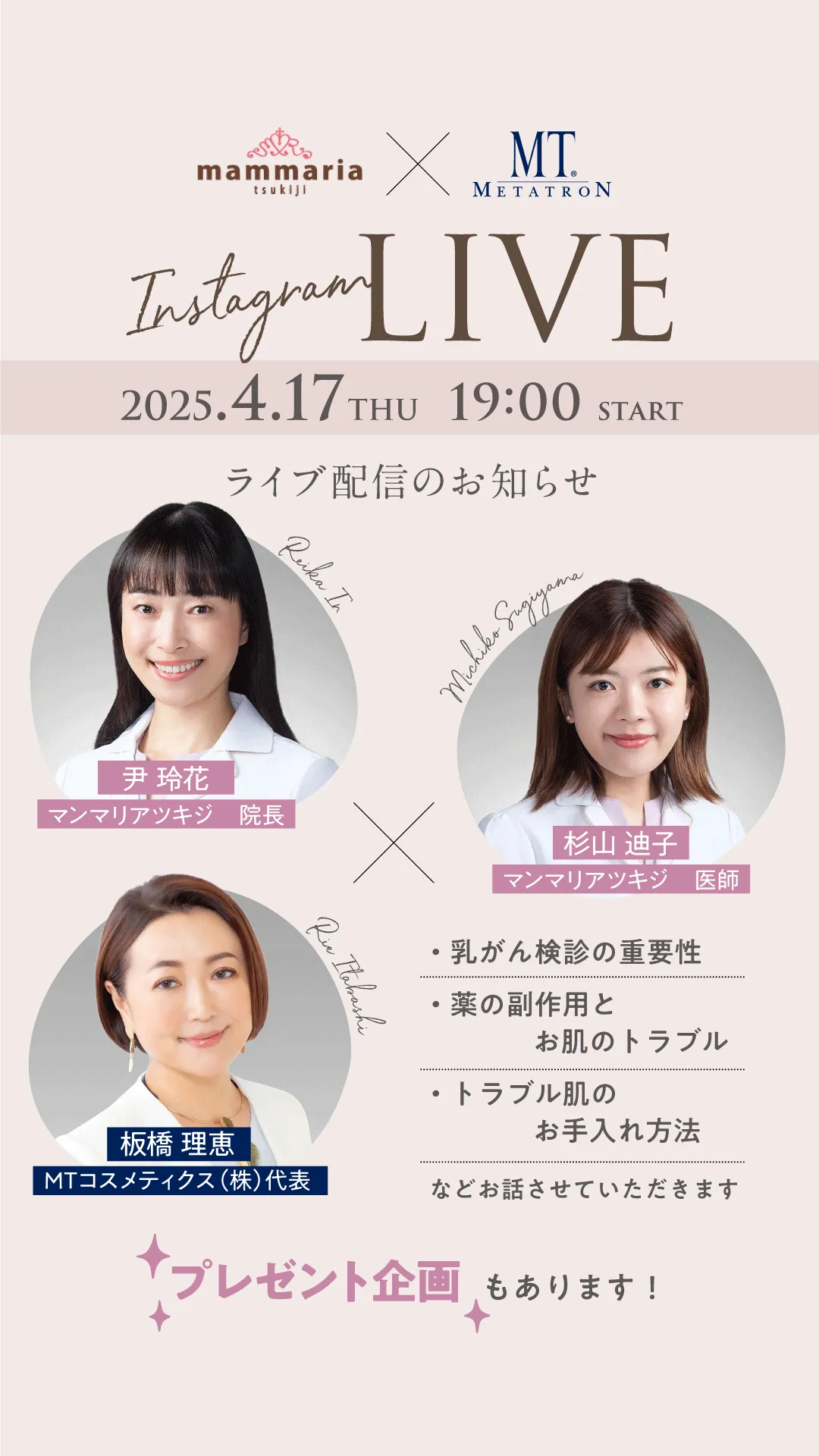 2025年4月17日(木)19時より、乳腺専門医の尹玲花院長と杉山迪子医師、そしてMTコスメティクスの代表取締役社長で美容実業家の板橋理恵が、インスタライブを通じて乳がん検診の重要性や女性ホルモンの肌への影響に関する最新情報をお届けします。このオンラインイベントは、誰でも自由に視聴でき、参加者からの質問にもリアルタイムで答える予定です。
