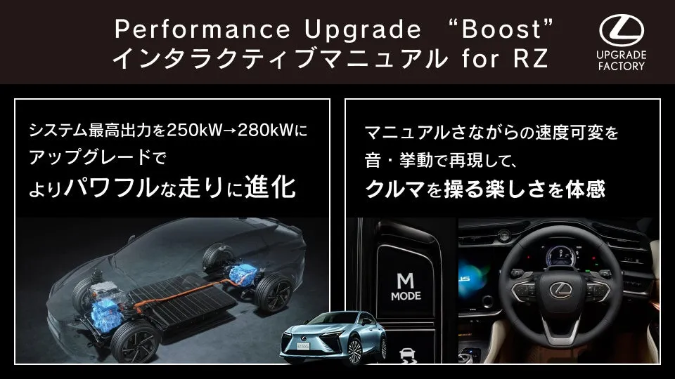 トヨタ自動車が展開する高級車ブランド、レクサス(LEXUS)は、最新のモデル RZ 500e “version L” に対する新しいパフォーマンスアップグレードを発表しました。このアップグレードは、「Performance Upgrade "Boost"」と「インタラクティブマニュアルドライブ」の二つの機能をセットで提供し、ドライビング体験を新たなレベルへ引き上げるものです。