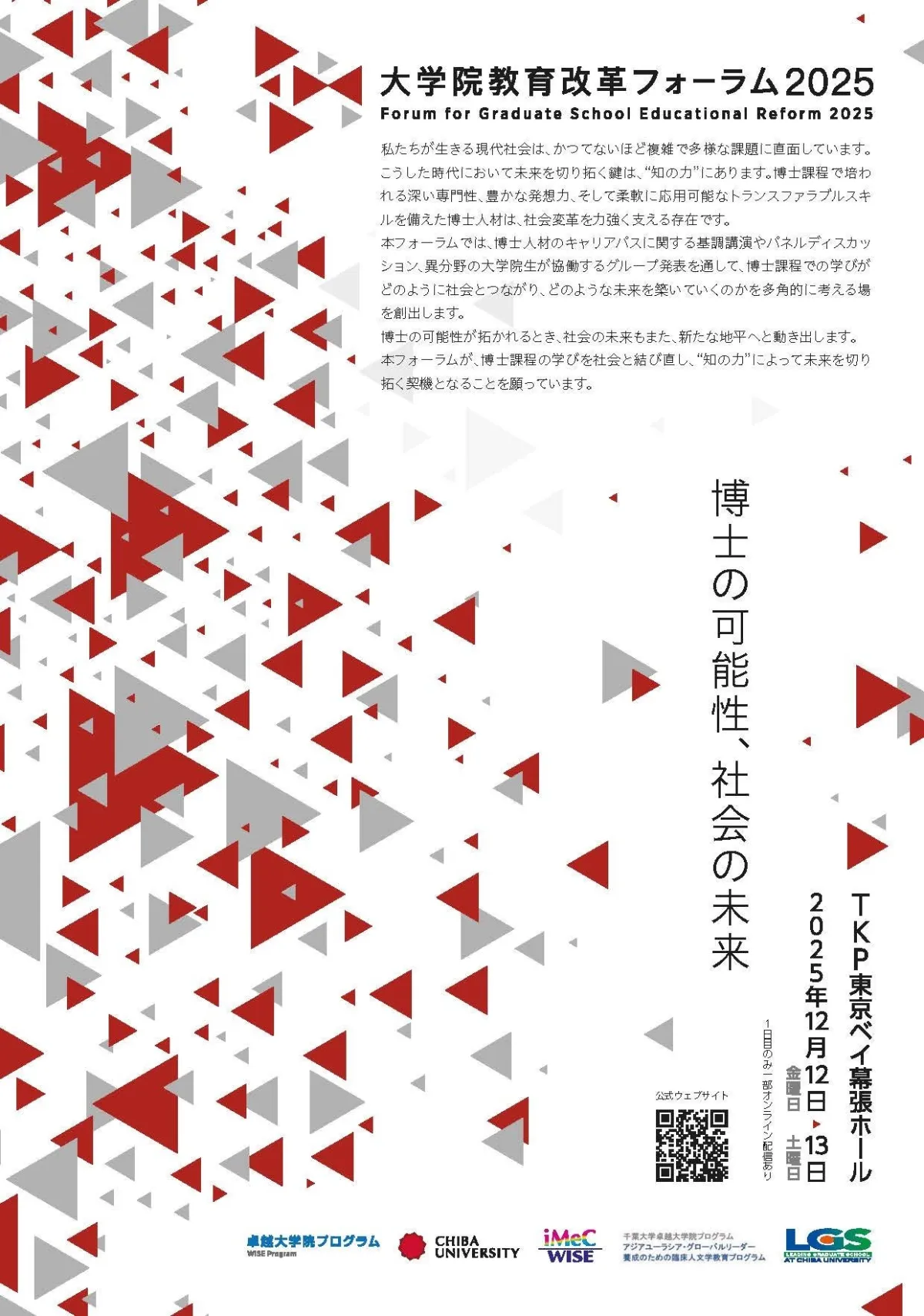 2025年12月12日(金)と13日(土)、千葉大学が主催する「大学院教育改革フォーラム2025―博士の可能性、社会の未来―」がTKPガーデンシティ幕張で開催されます。本フォーラムでは、アカデミアや企業の研究職にとどまらず、多様なフィールドで活躍する博士後期課程の人材が集結し、彼らがどのように社会で活躍しているかを探求します。