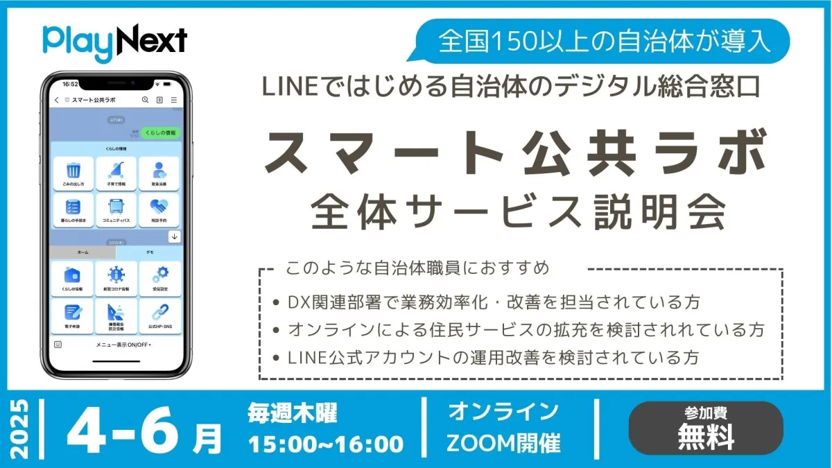 プレイネクストラボは、2025年4月から6月にかけて、スマート公共ラボの全体像や活用事例を詳しく解説する「全体サービス説明会」を定期的にオンラインで開催します。この説明会では、サービスの基本機能や先進事例を随時紹介し、DX推進に関心のある自治体職員や議員の方々に向けて詳細な情報を提供します。