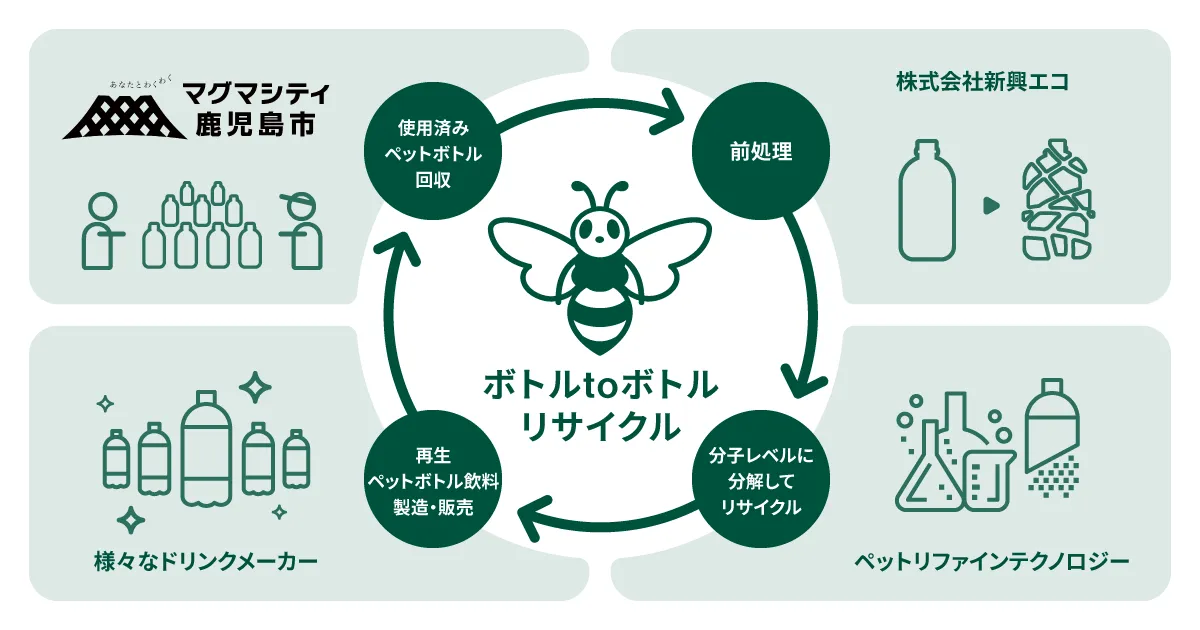 本協定を通じて、鹿児島市が回収した使い捨てのペットボトルが、JEPLANグループの技術によりボトルtoボトルのリサイクルプロセスで新たな資源として生まれ変わります。ペットリファインテクノロジー株式会社の「ケミカルリサイクル」と、株式会社サーキュラーペットの「メカニカルリサイクル」の二つの技術が組み合わさることで、リサイクル率の向上と再生PET樹脂の品質改善を目指します。このプロセスには、鹿児島市に拠点を置く新興エコも関わり、ペットボトルの前処理の一部を担当します。
