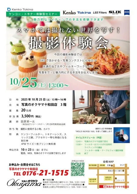 参加者には、ケンコー・トキナー製品の特価割引券や四切ワイドプリント1枚が無料で提供される特典もあります。写真撮影に興味のある方、特に初心者の方にとって、貴重な体験を得るチャンスです。ぜひこの機会をお見逃しなく!