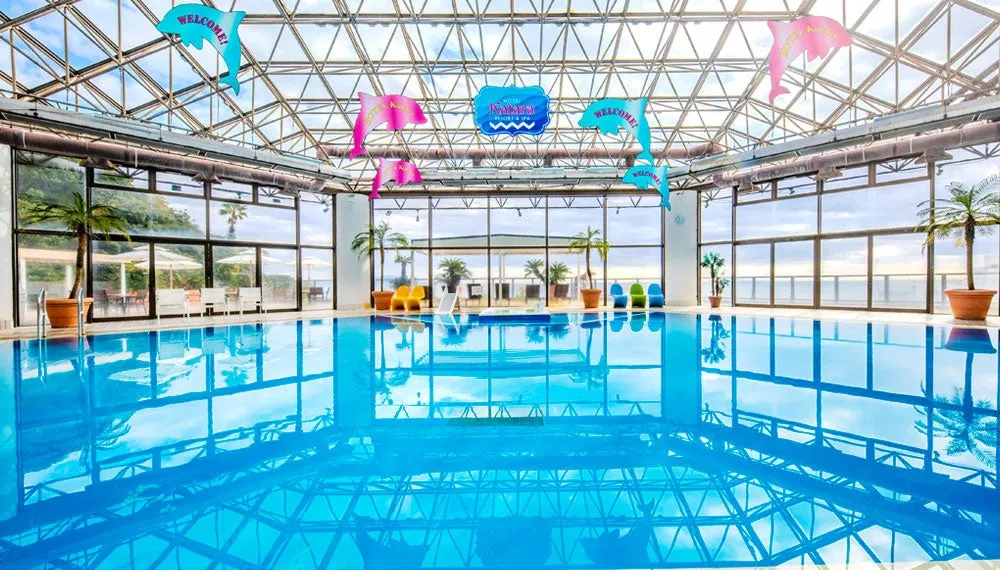 このホテルは、伊豆の美しい海を望む立地を誇り、源泉かけ流しの温泉が楽しめるファミリー向けのリゾートです。設備としては、全年齢層向けの屋内プールが完備されています。天候に左右されずに楽しむことができ、夜には幻想的なナイトプールも登場します。さらに、水着を着て楽しむ「ジャングルスパ」では、9種類の個性豊かな浴槽やウォータースライダーがあり、子どもたちにとっては夢のような遊び場です。