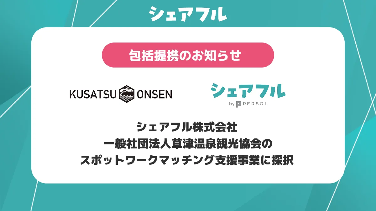 日本有数の温泉地、草津温泉。年間400万人を超える観光客が訪れる賑わいの一方で、地域内の人手不足が大きな問題となっている。宿泊業や飲食業を中心に、観光業に欠かせない人材が確保できず、観光客の増加に対して十分なサービスが提供できないという現状がある。そこで、一般社団法人草津温泉観光協会とスキマバイトアプリ『シェアフル』を運営するシェアフル株式会社が提携し、2025年8月26日にスポットワークマッチング支援事業を開始する運びとなった。