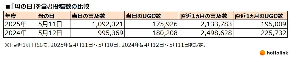 調査結果によると、2025年の母の日における「母の日」を言及する投稿数は約109万件で、2024年と比較して約9.8%の増加を見せています。一方、この日のUGC(ユーザー生成コンテンツ)数は約17.6万件と、前年に比べて2.4%減少しています。特に直近1ヵ月間でも、全体的に言及数・UGC数が2024年と比較し減少していることがわかりました。