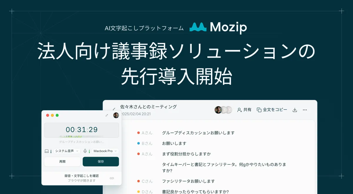 株式会社ENIAQは、東京都文京区に本社を構え、ローカル実行型のAI文字起こし技術「Mozip」を開発しました。この革新的な技術により、法人向けの議事録ソリューション「Mozip Enterprise」の先行導入パートナー企業を募集中です。