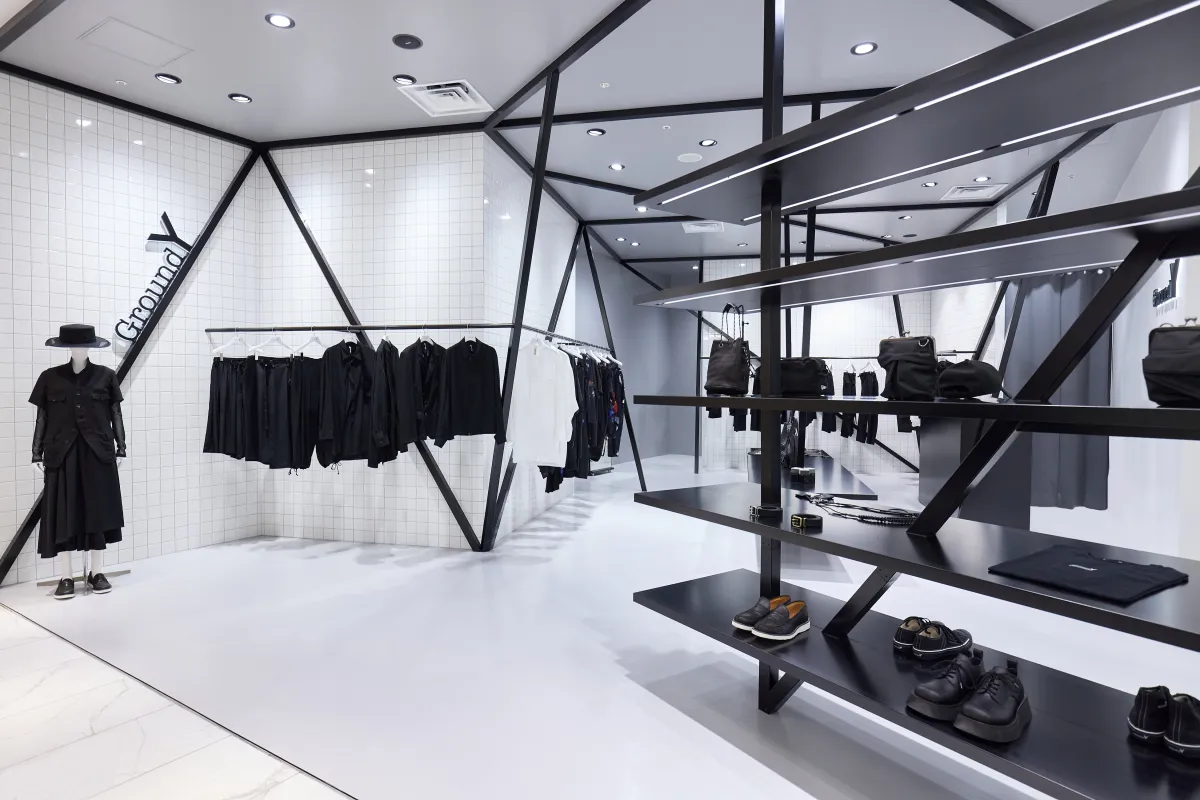 リニューアルされた店舗のデザインは、主に白いタイルと黒いフレームで構成されており、このコントラストが重厚感を生み出しています。シンプルな中にも奥深さを感じさせるこのデザインは、Ground Yのファッション哲学である多面的なアプローチを映し出しており、訪れる人々に強い印象を与えます。