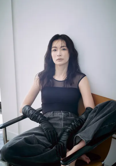 長谷川京子氏がビジュアルで着用しているボディスーツは、アウターとしても使える汎用性が高いデザインです。透け感のあるパワーネットが肩部分に施され、クリーンでセンシュアルな印象を与えます。