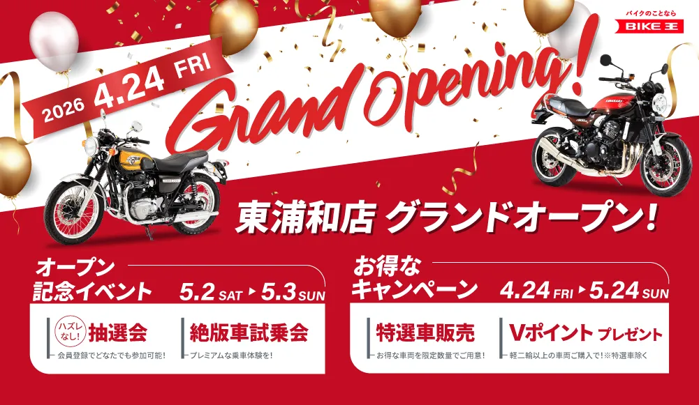 オープンを祝して、5月2日(土)・3日(日)の2日間にはオープニングイベントが開催されます。これには、豪華景品が当たる抽選会や、希少な絶版車の試乗会、特選車の販売、さらには126cc以上のバイク購入者にVポイントを進呈するキャンペーンが含まれます。
