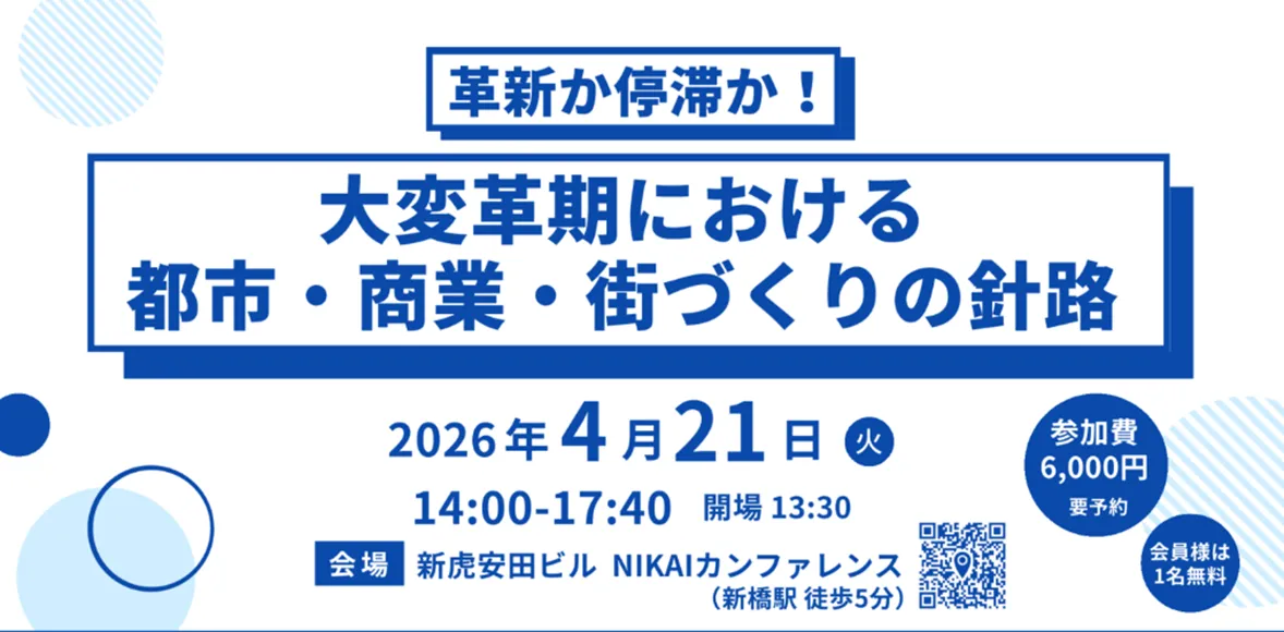 2026年4月21日(火)、新虎安田ビル NIKAIカンファレンスで、株式会社賑わい創研が主催するシンポジウム「大変革期における都市・商業・街づくりの針路 〜革新か停滞か!〜」が行われます。社会の変化に直面する中で、都市計画や商業の未来を考える重要な機会となるでしょう。
