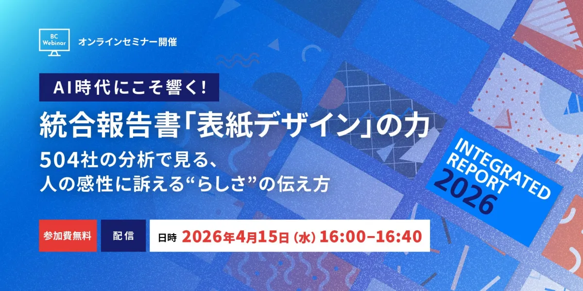 2026年4月15日(水)16:00から16:40まで、株式会社ブレーンセンターが「統合報告書『表紙デザイン』のトレンド・事例紹介ウェビナー」を開催します。 参加費は無料で、多くの企業が抱える表紙デザインに関する悩みや課題に寄り添った内容が提供されます。