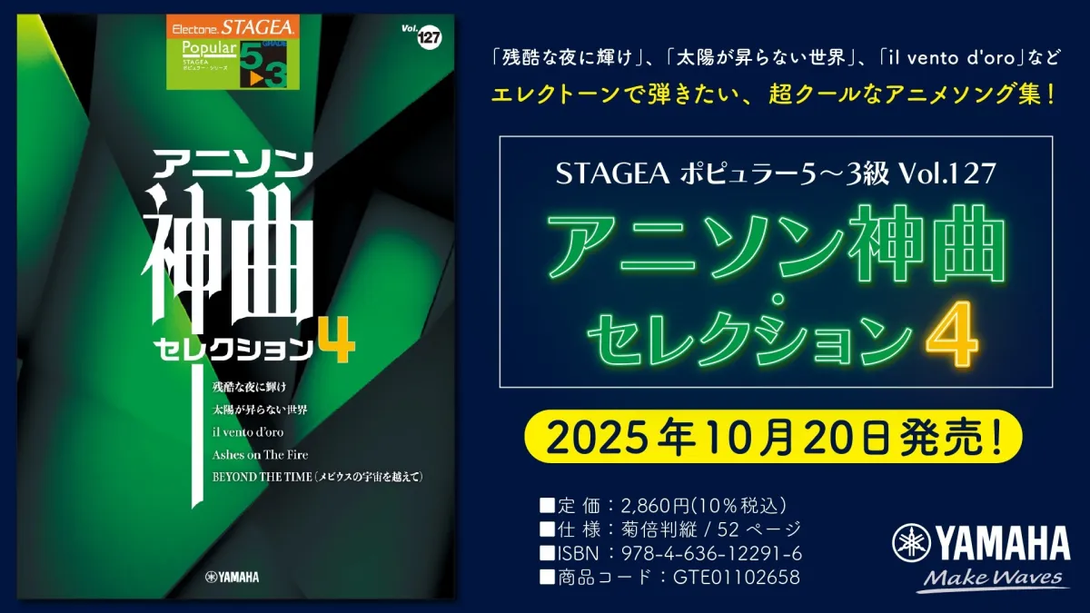 2025年10月20日、株式会社ヤマハミュージックエンタテインメントホールディングスから新刊「エレクトーン STAGEA ポピュラー5~3級 Vol.127 アニソン神曲・セレクション4」が発売されます。この楽譜集は、人気アニメの主題歌から世代を超えて親しまれる名曲までを集めた、アニメファンや楽器愛好者にとってたまらない一冊です。