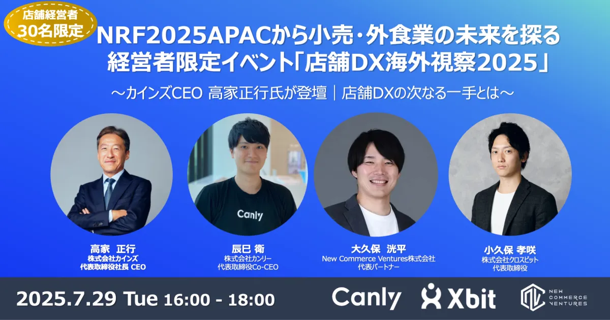 主催は、株式会社カンリー、New Commerce Ventures株式会社、そして株式会社クロスビットの3社で、特別ゲストとしてカインズのCEO高家正行氏が登壇し、小売業界の変革に関するリアルな知見を共有します。