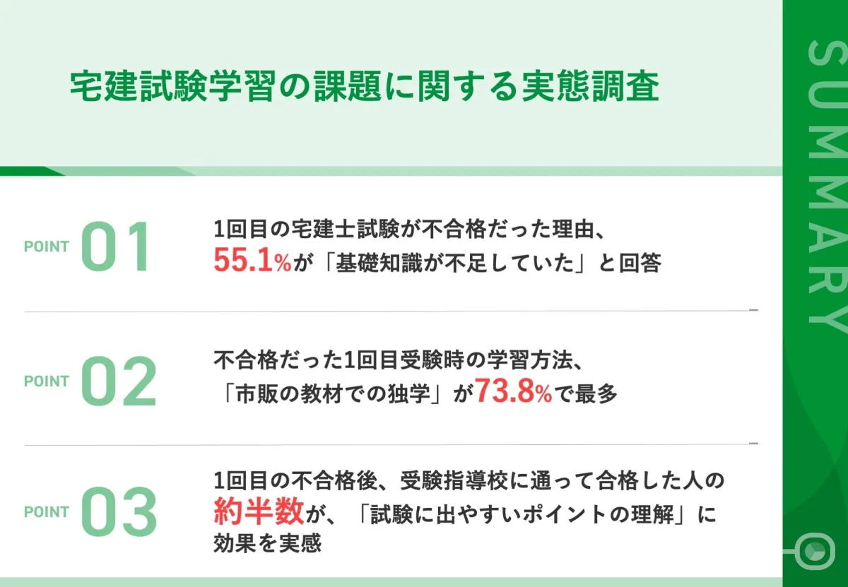 調査では、宅建士試験において不合格となった理由として「基礎知識が不足していた」と答えた受験生が最も多く、続いて「効率的な勉強ができなかった」「覚えるポイントがわからなかった」という声も多く見られました。このことからも、基礎知識の充実が合格への鍵となることが明らかです。