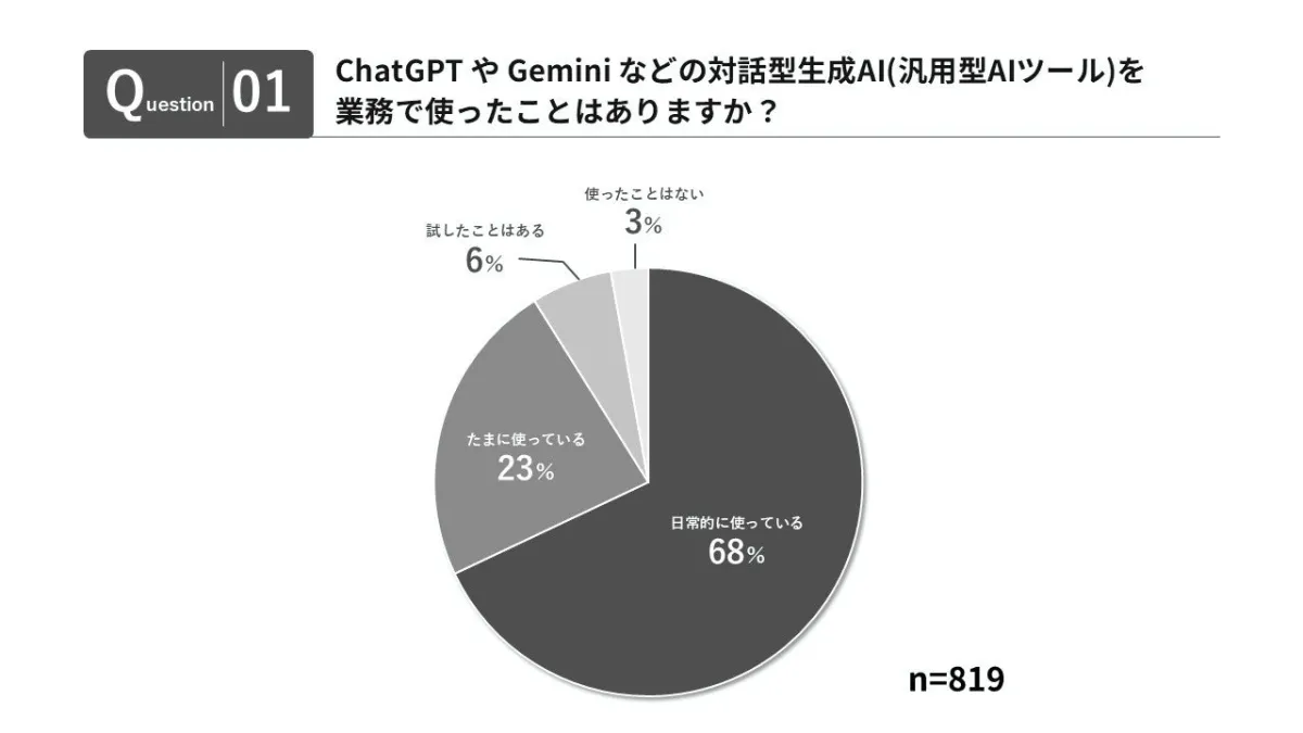 この調査は、2026年2月16日から18日までの期間に、従業員数が1,000名以上の日本国内企業に勤務する正社員819名を対象に行われました。調査の結果、多くのビジネスパーソンが生成AIを利用するようになった背景には、特別なツールから現場での標準インフラへと進化した実態があることが示されています。