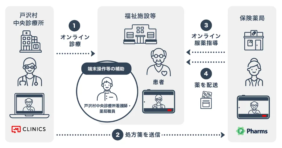 本事業では、医療機関が災害時にも患者のニーズに応えるため、福祉施設内においてオンライン診療と薬剤師によるオンライン服薬指導を行います。この取り組みでは、福祉施設の受診スペースにて、患者はタブレットPCを通じて戸沢村中央診療所の医師と接続し、診察を受けることができます。看護師の補助によりスムーズな診察が可能となり、処方された薬は薬局にてオンラインで指導を受けながら配送されます。