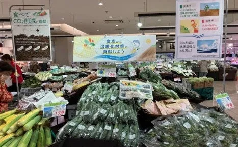 販売実証当日は、トウモロコシ、オクラ、キュウリなど14品目の夏野菜が店頭に並びました。消費者は、生産者から直接商品説明を受けることができ、また購入後には意識調査も行われ、温暖化対策に対する関心の高さが伺えました。