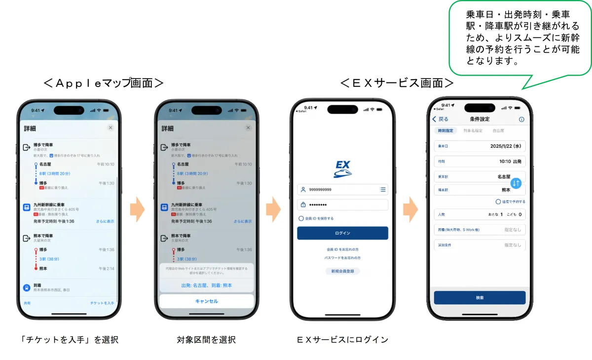 Appleマップの経路検索を使って新幹線を探した際、検索結果に「東海道・山陽・九州新幹線」が表示されると、そこに「チケットを入手」というボタンが登場します。このボタンをタップすることで、EXサービスのログイン画面に誘導され、出発日や時刻、乗車駅、降車駅といった情報が自動的に引き継がれ、スムーズに予約が可能です。これによって、手間なく新幹線が利用でき、旅行の計画が立てやすくなります。