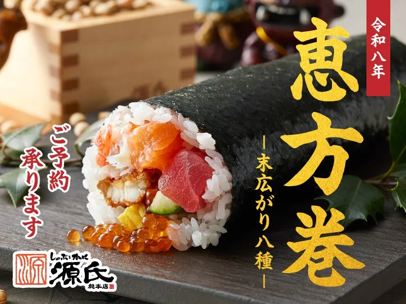 愛知県豊橋市に本社を置く株式会社物語コーポレーションは、全く新しい恵方巻を2026年の節分に向けて数量限定で販売します。埼玉県と愛知県に展開する「しゃぶとかに 源氏総本店」では、まぐろやかに、いくら、富士鱒、穴子など計8種の贅沢な具材をふんだんに使用した恵方巻の予約を開始しました。