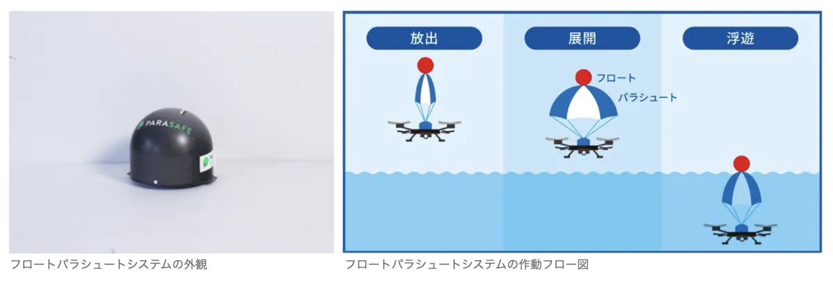 この装置は、水上を飛行するドローンに特化した安全装置で、フロート機能とパラシュート機能を組み合わせて構成されています。水上での飛行中に発生する緊急事態に備えることが可能です。万が一ドローンが水に墜落したとしても、パラシュートが衝撃を和らげ、フロートが浮揚させることで、機体の回収をサポートします。