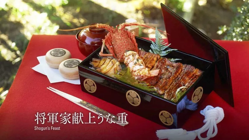 - - 内容:大トロうなぎ×2尾、伊勢海老1尾、あわび1個、竹箸、お吸物、葵紋付お重、山椒、山椒入れ、掛軸型おしながき