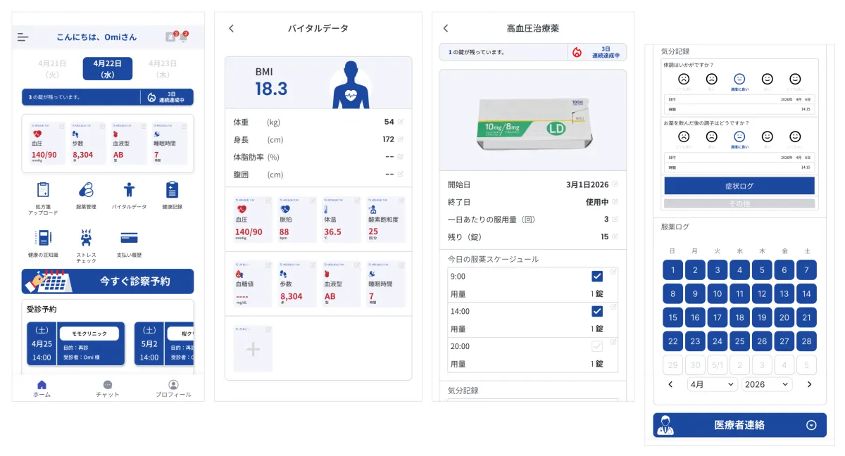 服薬管理: 患者が服薬状況を記録し、アドヒアランスを向上させます。
