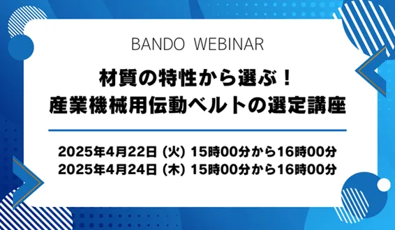 バンドー化学株式会社は、2025年4月22日と24日にオンラインウェビナーを開催します。このセミナーは「材質の特性から選ぶ!産業機械用伝動ベルトの選定講座」と題し、産業機械に欠かせない伝動ベルトの特性や選定について学ぶ一大イベントです。