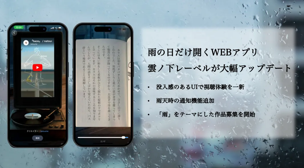 雨の日のみアクセス可能なWEBアプリ、『雲ノ下レーベル』が大幅にリニューアルされました。このアプリは、株式会社アラヤが提供しており、最新技術を用いた独自の音楽や小説、映像の体験を提供しています。今回のアップデートは、より没入感のあるデザインと新機能の追加によって、ユーザーに新たな体験をもたらします。