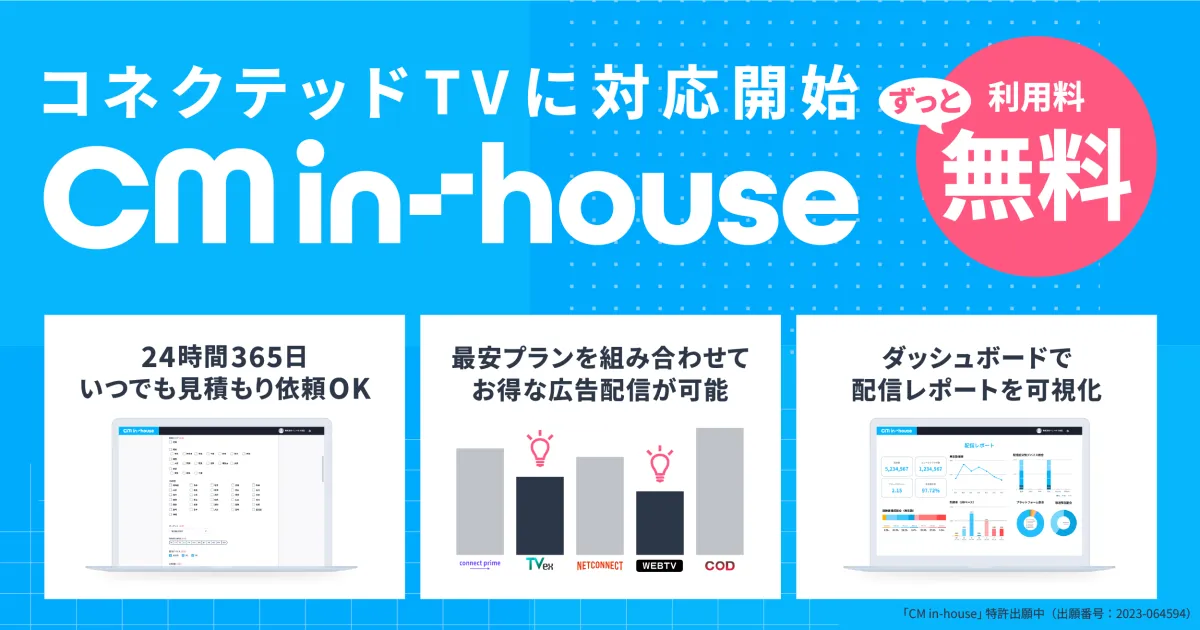 CMインハウスは、広告主が自社のCMを見積もり、購入し、放映し、その後の効果検証までを行える完全無料のダッシュボードシステムです。これまで地上波のTVCMのみを対象としていましたが、今回のアップデートにより、コネクテッドTV広告にも対応することができ、すべてのデータを広告主が保有できるようになります。