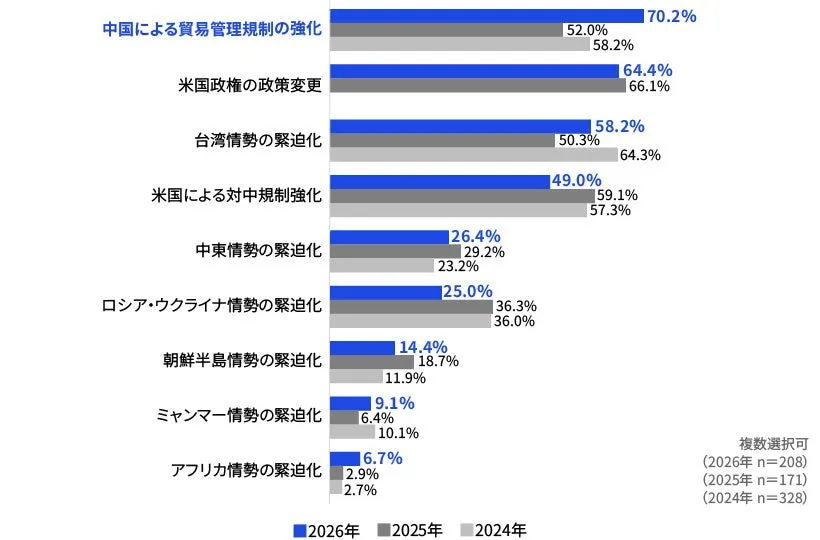 調査によると、企業の70.2%が中国の貿易管理規制強化について懸念を持っており、これは前回調査の52.0%から大きく増加した結果です。多くの企業がサプライチェーンの依存度を低下させることを検討しており、特に売上高5,000億円以上の大企業では57.4%がその方針を持っています。この変化は、企業が国際的な政治経済環境に強い影響を受ける中で、自社の経営戦略を再構築しようとする意志の表れと言えます。