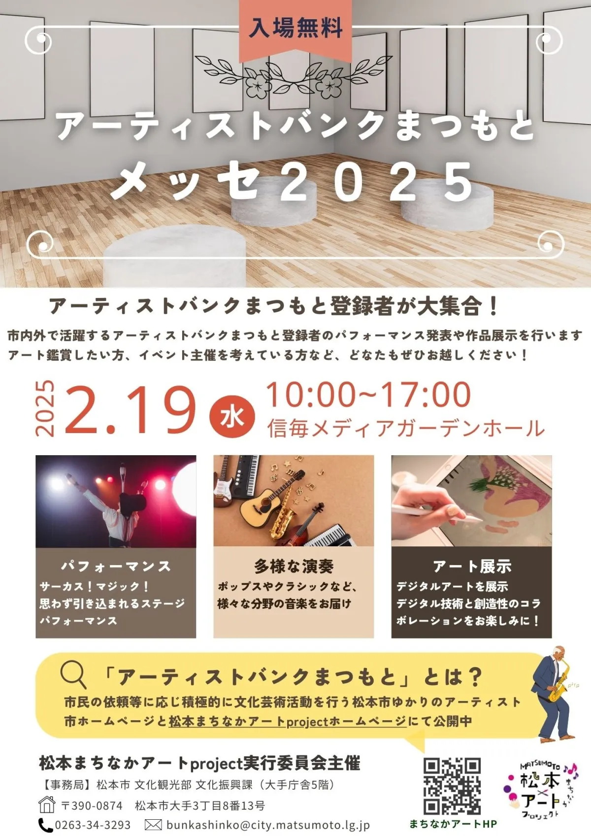 2025年2月19日、水曜日に松本市で開催される「アーティストバンクまつもとメッセ2025」は、地域で活動するアーティストやクリエイターたちによるパフォーマンス発表や作品展示の場です。このイベントは、アート鑑賞が好きな方や、イベントを企画している方など、幅広い方々に楽しんでいただけることを目的として開催されます。
