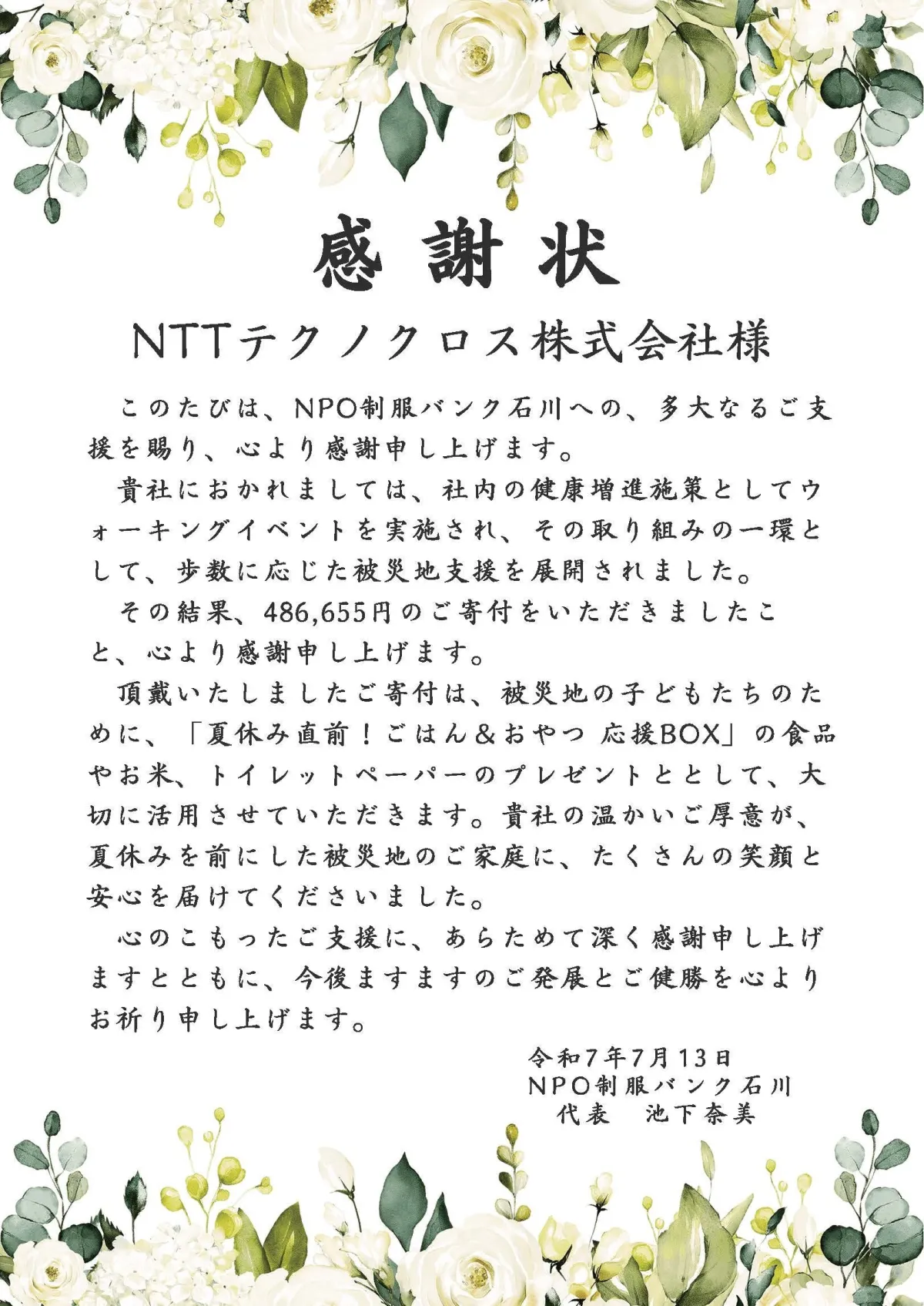 NTTテクノクロス株式会社は、2023年度から参加社員の総歩数に応じて寄付金を算出する「ウォーキングイベント」を通じて、能登半島地震の復興支援を行っています。2025年5月に実施予定のこのイベントでは、社員が参加した結果として得られた486,655円が、NPO法人制服バンク石川に寄付されることが決まりました。