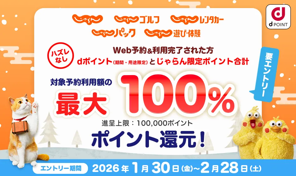 株式会社NTTドコモが提供する旅行予約サイト「じゃらんnet」にて、2026年1月30日(金)から2月28日(土)まで「最大全額ポイント還元キャンペーン」が実施されます。このキャンペーンは、リクルートIDを使用して予約を行い、特定の条件を満たすことで、利用額の最大全額分のdポイントが還元されるというものです。