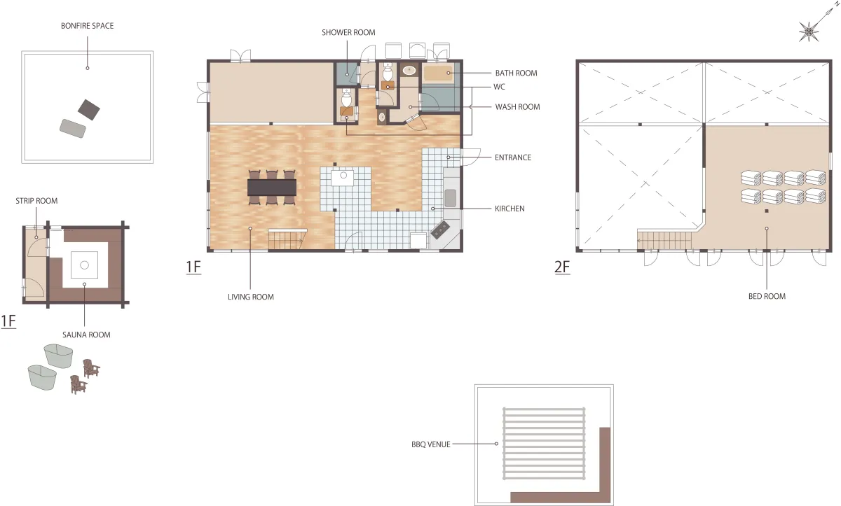 SHELTER.ブランドのすべての施設には、薪サウナ、焚火台、BBQ設備が備わっており、天候を気にせずアウトドア体験ができます。身体を温めながら、自然の中で「ととのう時間」を楽しむことができるのです。