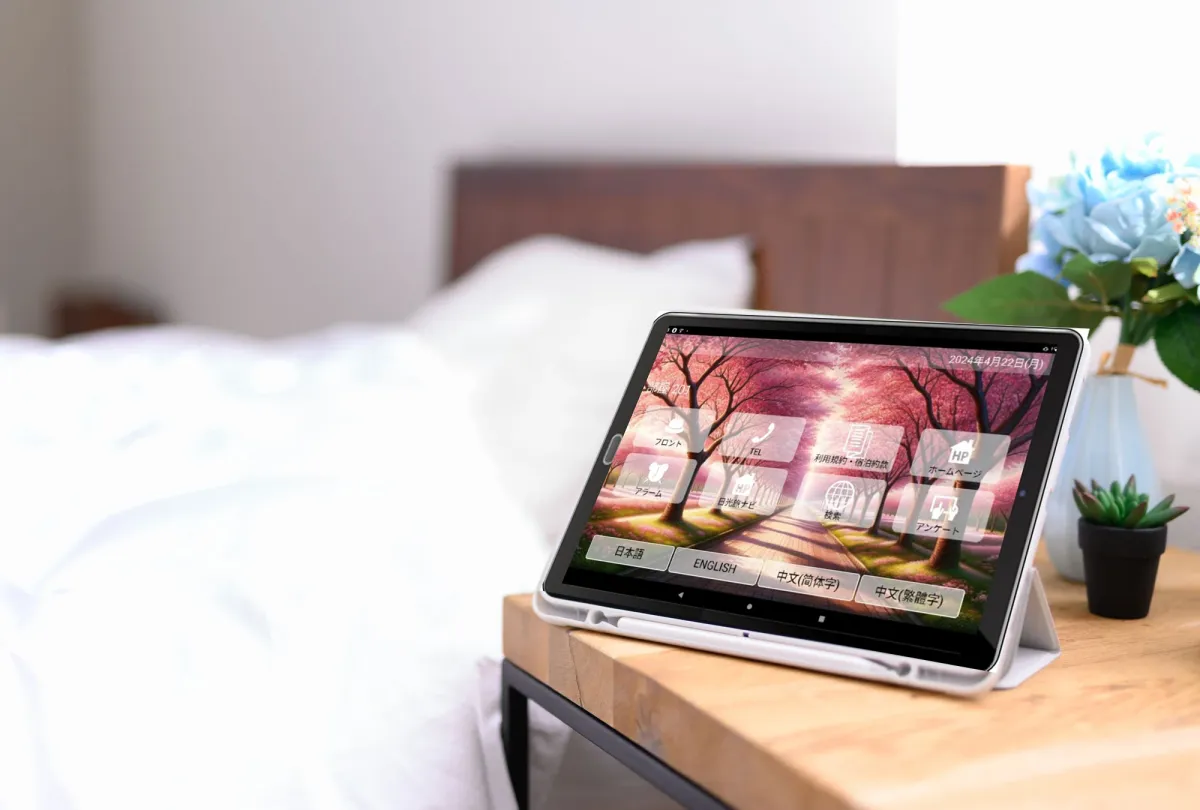 バルテックが提供するMOT/Hotel Phoneは、ゲスト用のタブレットで、内線機能や館内案内を簡単に利用できるシステムです。これにより、固定電話を設置する必要がなくなり、各種言語に対応した情報提供が可能となります。宿泊者の満足度を向上させながら、業務を効率化することが期待されます。