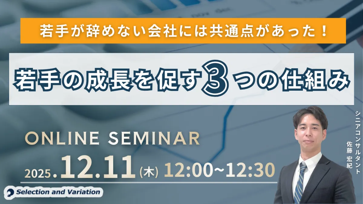 若手社員の早期離職は、企業にとって深刻な課題として認識されています。セレクションアンドバリエーション株式会社が開催するセミナーでは、若手社員の成長を促し、企業内での定着を実現するための効果的な3つの仕組みについて解説します。ここでは、その内容を詳しくご紹介します。