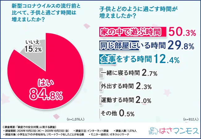 リモートワークを経て、お子さんとの過ごす時間が増えた親も多いですが、同時に日常の監視が難しい中での事故も懸念されています。調査によれば、72.4%の親が「リモートワークによって子供との遊びや時間が増えた」と回答している一方で、家庭内の事故を未然に防ぐ必要性が強く認識されています。