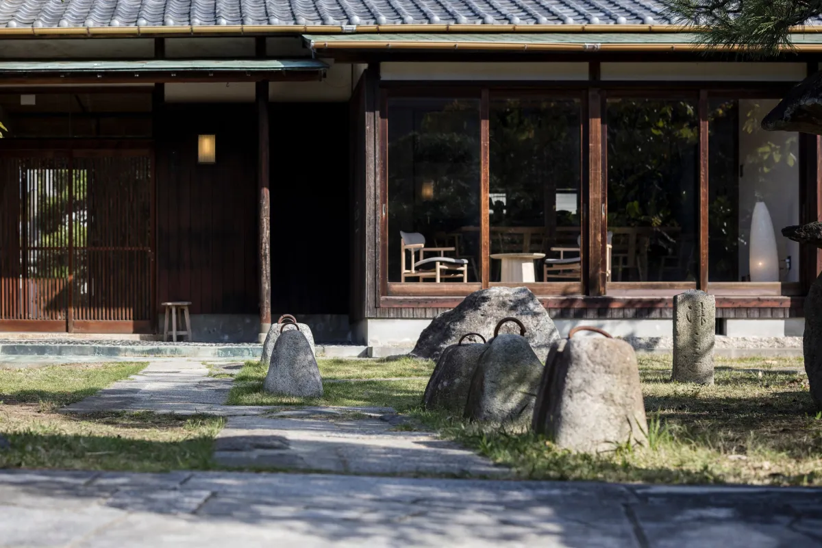 お屋敷ステイ 幸の玄関アプローチは、大小さまざまな重石が等間隔に並ぶ石畳で構成されています。これらの重石は、かつて醤油を絞る際に使用されていたもので、長い年月の中で刻まれた傷や丸みが、その歴史を物語っています。宿の再生に際して、これらの重石を撤去する案もありましたが、宿泊者がこの風景を通じて家の歴史を感じてほしいとの願いから、敢えて残す選択がなされました。重石を横目に進むことで、訪問者はこの家が歩んできた時間の上を歩く体験を得ることができるのです。