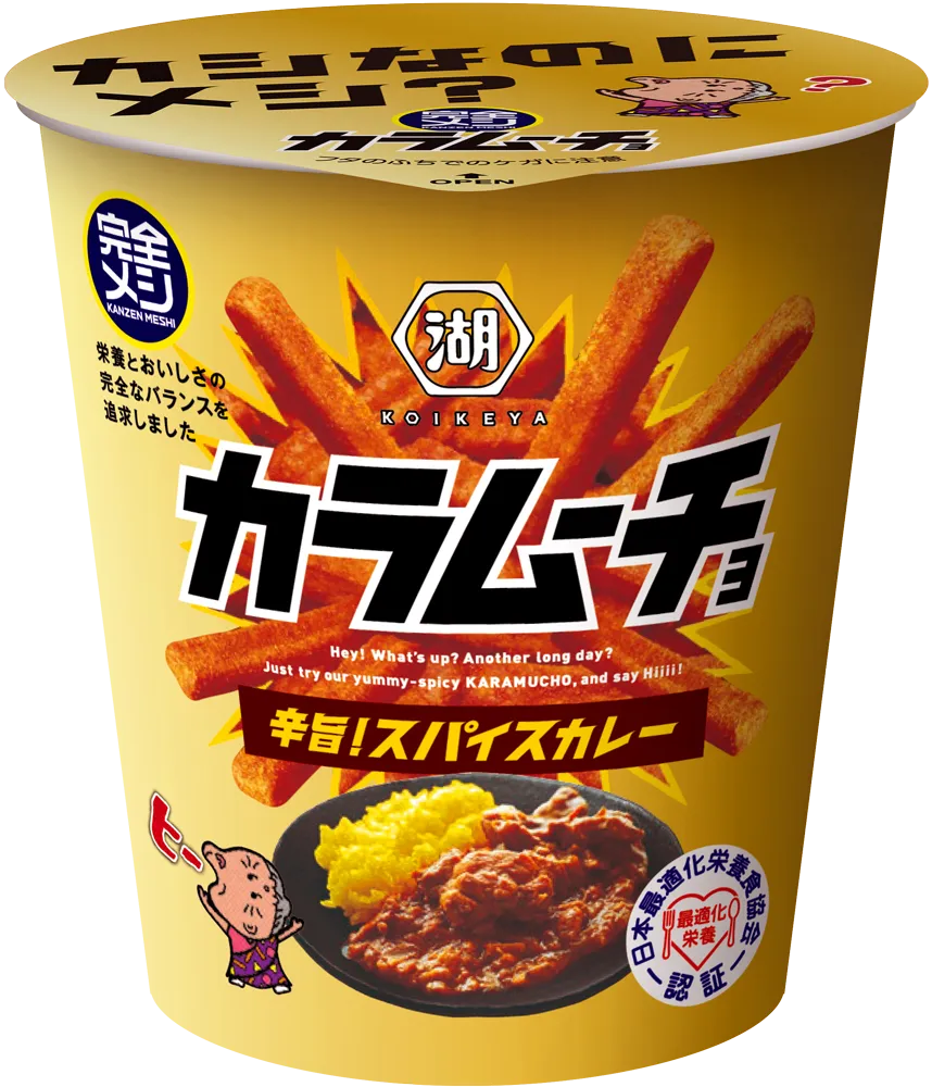 「完全メシ カラムーチョ 辛旨!スパイスカレー」は、スティック形状で食べやすく、しかも持ち運びにも便利なカップ型容器に入っています。外出先や勉強の合間に手軽に栄養を補給できるため、忙しい現代人に最適なスナックです。