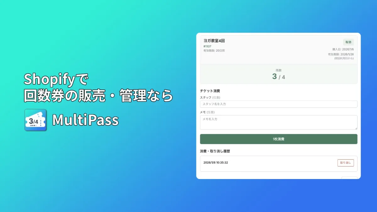 株式会社FITONLINEが新たにリリースした「MultiPass」は、回数券やチケット管理を専門にしたアプリです。特に、ジム、スタジオ、エステ、料理教室などの回数制サービスを提供する事業者向けです。このアプリを導入することで、Shopifyストア上で回数券を簡単に販売・管理できるようになります。
