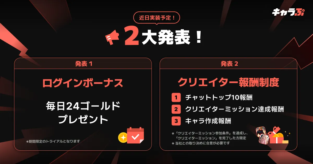 次に発表されたのは、ユーザーからの要望に応えて復活する「ログインボーナス」です。このボーナスを受け取ることで、ユーザーは毎日「キャラぷ」にログインするたびに24ゴールドをもらうことができます。ログインボーナスは、1か月間のトライアル期間中に実施される予定で、ユーザーの利用頻度向上や新規ユーザー獲得の一助となることを期待しています。