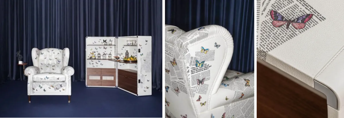 本コラボレーションは、ポルトローナ・フラウの歴史を象徴するアームチェア「1919」と、トランク型ドリンクキャビネット「Isidoro(イシドロ)」を中心に展開されます。これらの家具は、フォルナセッティの代表的なデザインモチーフ「Ultime Notizie(ウルティメ・ノティツィエ)」で再解釈されました。
