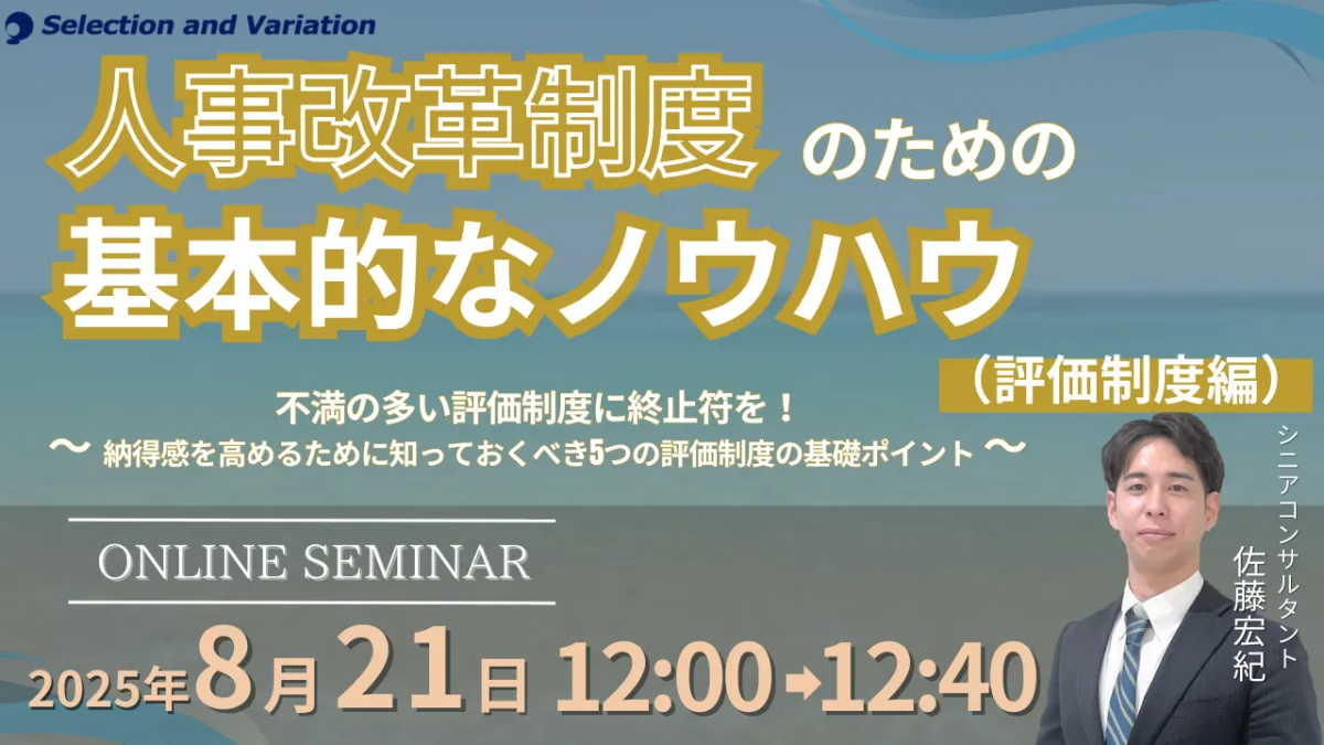 人事制度改革は、企業に、特にVUCA(変動性・不確実性・複雑性・曖昧性)の時代において、喫緊の課題となっています。特に多くの企業では、従来の年功序列制度から脱却し、成果やスキルに基づく評価制度の構築が急務です。このような背景のもと、セレクションアンドバリエーション株式会社は、『人事制度改革のためのノウハウ(評価制度編)』セミナーを2025年8月21日に開催します。