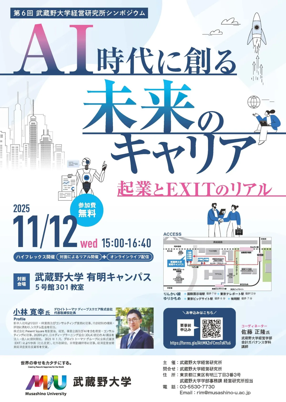 2025年11月12日、武蔵野大学の経営研究所が主催するシンポジウム「AI時代に創る未来のキャリア 起業とEXITのリアル」が、武蔵野大学有明キャンパスで実施されます。このイベントには、デロイト トーマツ ディープスクエア株式会社の代表取締役社長、小林寛幸氏が登壇し、AIビジネスの実体験を共有します。