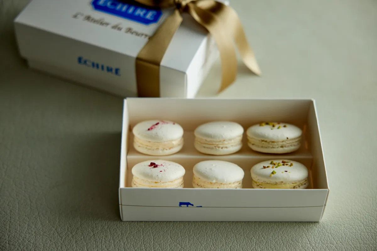 この贈り物の中でも特に人気なのは『マカロン・オ・ブール・エシレ 6個入ギフト』です。伝統的なマカロンの枠を超え、エシレバターをたっぷりと使用した香り高いバタークリームを、白いマカロン生地にサンドしています。見た目も華やかで、味わいも特別感にあふれる一品です。フレーバーは3種類、エシレバターのナチュラルな風味を感じられる<ナチュール>、香り豊かなピスタチオとグリオットチェリーのアクセントの<ピスターシュ>、フランボワーズコンフィチュールを使用した<フランボワーズ>が揃っています。どれもエシレらしさが詰まっており、大切な方への贈り物として選ばれる理由がわかります。