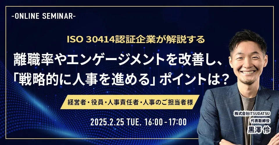 2025年2月25日(火)、株式会社ITSUDATSUが主催する無料Webセミナー「ISO30414認証企業が解説する〜離職率やエンゲージメントを改善し、戦略的に人事を進めるポイントとは〜」が開催されます。このセミナーは、経営者や人事担当者を対象に、人的資本経営に関する具体的な戦略や実績をシェアすることを目的としています。